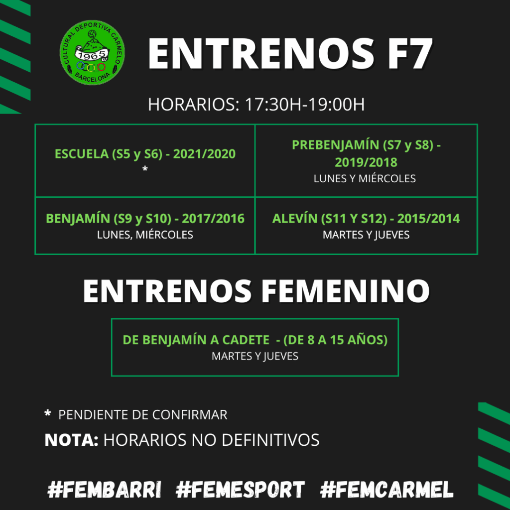 - PREBENJAMÍ 2019 (S7): Dilluns i Dimecres de 17:30 a 19:00.
